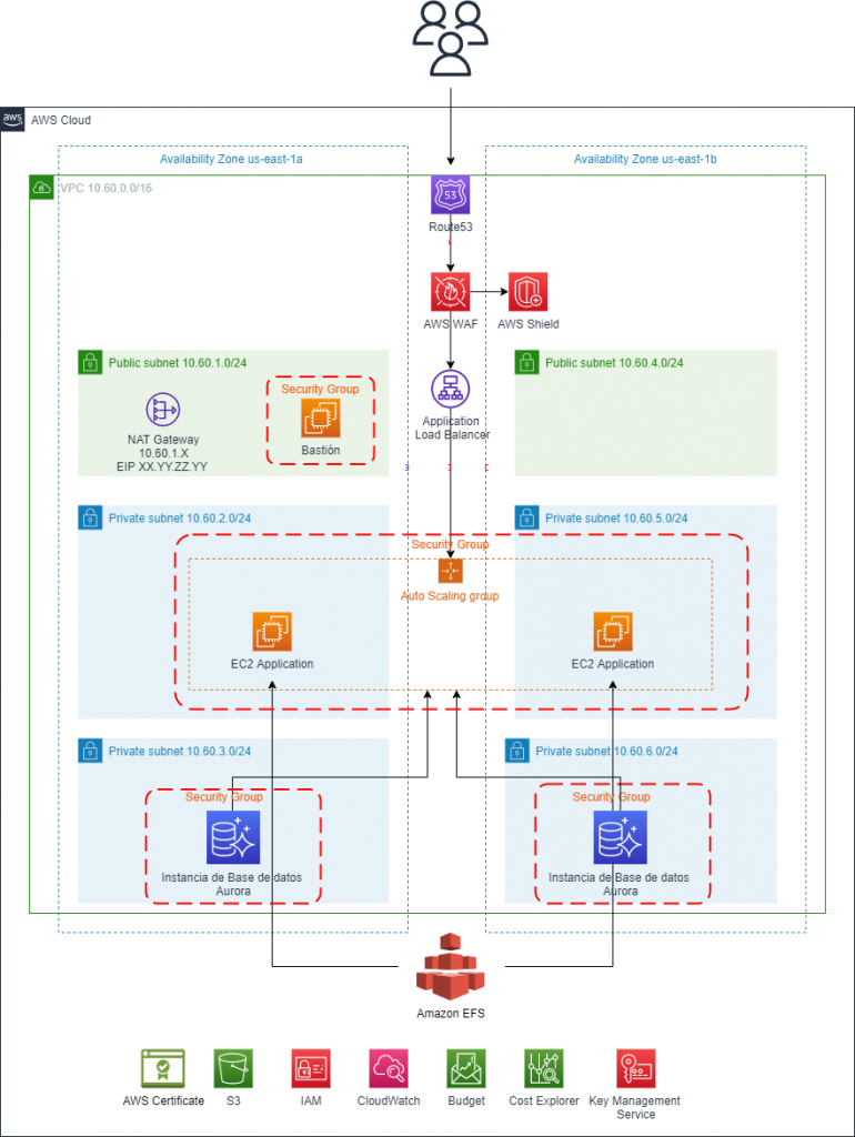 In addition, very specific rules were configured to control the traffic towards the instances in the Security Groups and the Network ACLs are used for restrictions. Likewise, the AWS Web Application Firewall was enabled to protect the solution from cyber attacks, the AWS Shield was also enabled to protect the solution against DDoS attacks.