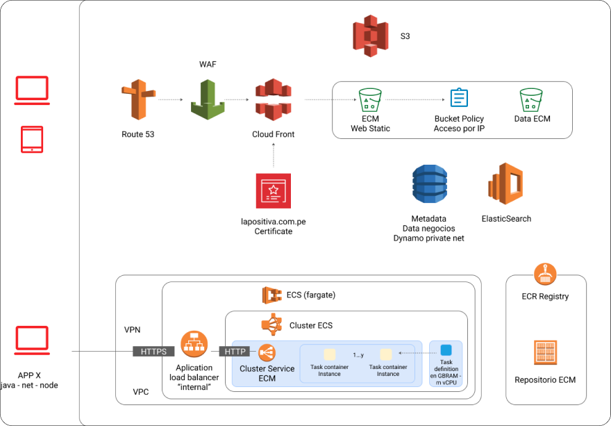 Desarrollamos una solución de ECM basada en una aplicación de back-end con una arquitectura de microservicios. La tecnología utilizada incluía componentes serverless como ECS Fargate, DynamoDB y ElastiSearch. La aplicación frontend también se creó en una arquitectura serverless, usando componentes como S3, Cloudfront, WAF y Route 53. La solución Illary se usó para la aplicación backend, aprovechando componentes serverless como Lambda, API Gateway, DynamoDB, SNS y SES.